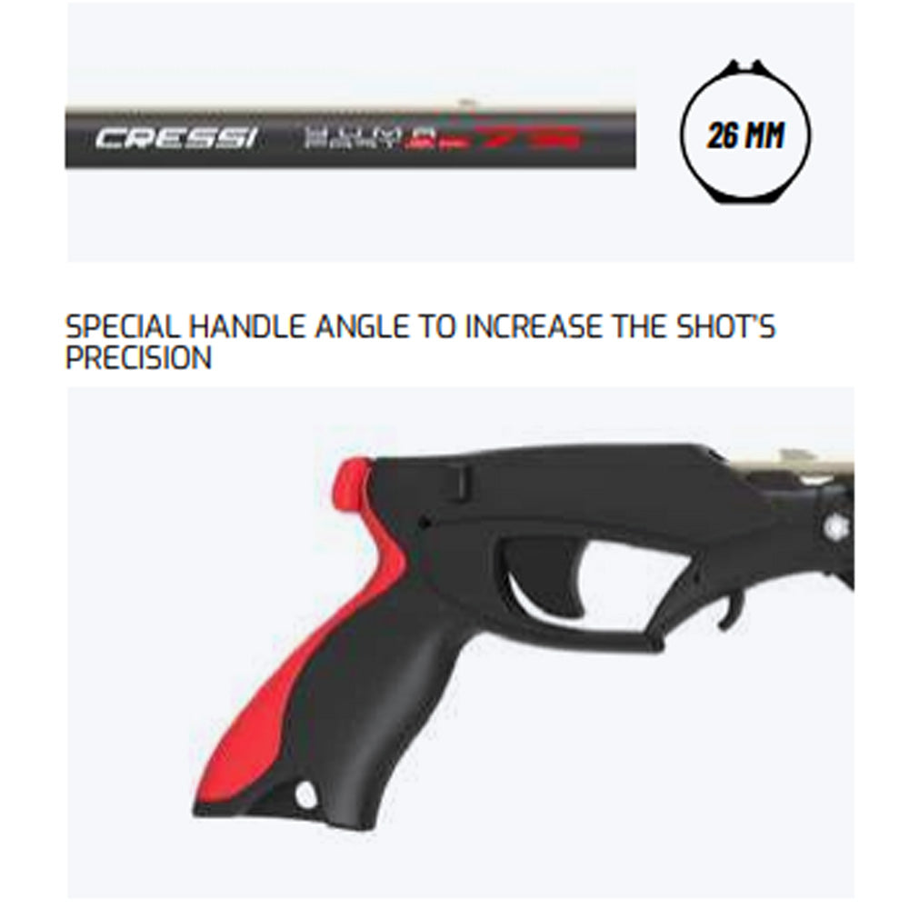 Διαθέτει μαύρο σωλήνα από ανοδιωμένο αλουμίνιο, με ενσωματωμένο οδηγό βέργας, Η λαβή είναι από ενισχυμένο πλαστικό με ανοξείδωτο μηχανισμό σκανδάλης. Η κεφαλή είναι ανοιχτού τύπου με δυο λάστιχα 14mm και μαγνήτη που κρατά σταθερά την βέργα στο όπλο.